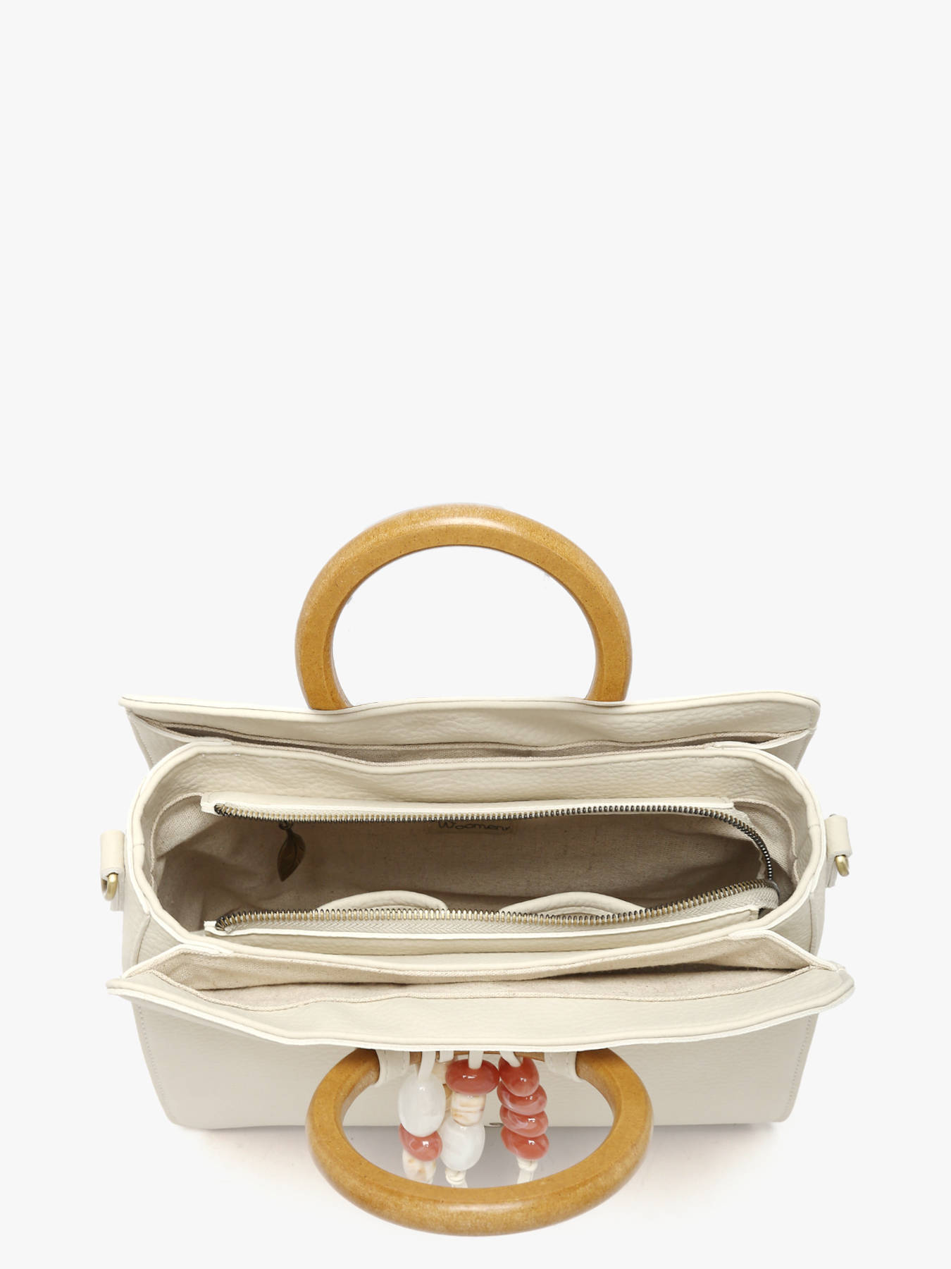 De handtas WOOMEN formaat M uit de lijn Camomille Pearl valt op door zijn delicate parelfranjes, gecombineerd met houten ringen, voor een moderne en verfijnde landelijke uitstraling. Gemaakt van polyurethaan met 58% gerecyclede materialen en een voering van katoen en linnen, biedt hij lichtheid en stevigheid voor dagelijks gebruik. De drie compartimenten, waaronder één met ritssluiting, het binnenste ritsvak en de voor- en achtervakken, zorgen voor optimaal opbergen van je persoonlijke spullen. De iriserende, verstelbare en afneembare band maakt het mogelijk de tas aan de hand of op de schouder te dragen, afhankelijk van je voorkeur. Het gouden resinelogo en het nieuwe onderscheidende logo geven een eigentijds en elegant vleugje. Met zijn verzorgde afwerking en pareldetails wordt deze tas een uniek, praktisch en stijlvol accessoire, dat al je outfits complementeert, van casual tot gekleed.