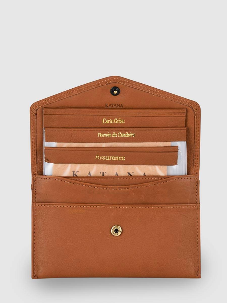 Handige lederen papierhouder van het merk Katana. Het model laat zich sluiten met flap en drukknop en is van verschillende plastiekjes voorzien. Ideaal voor het opbergen van belangrijke documenten. Verder zijn er ook nog 2 gewone opbergvakken.